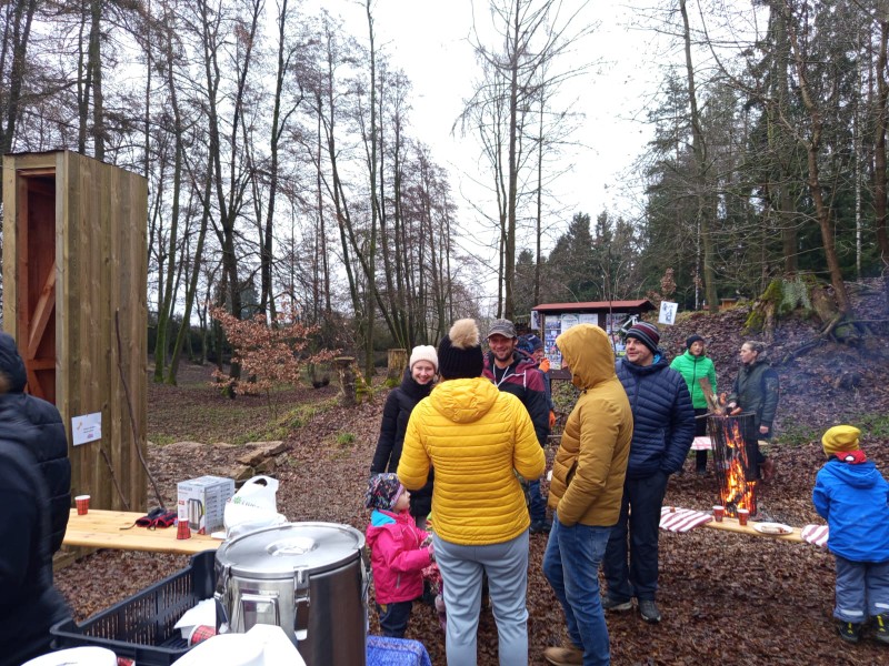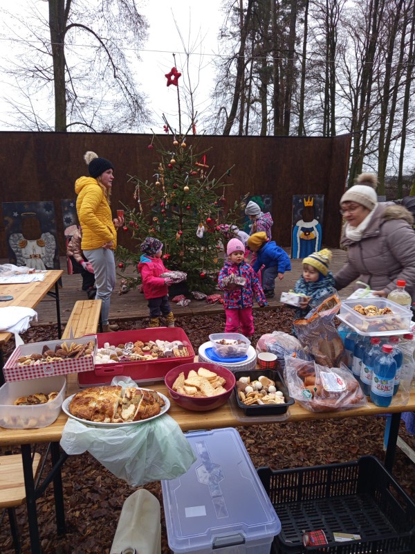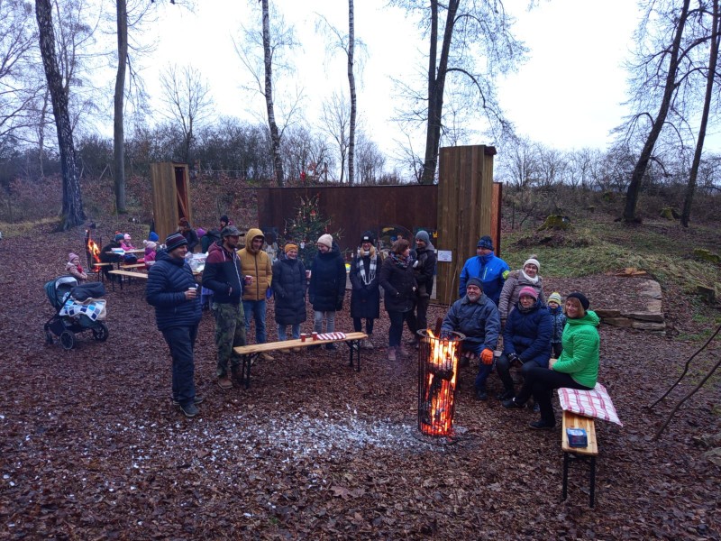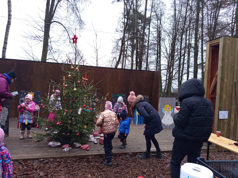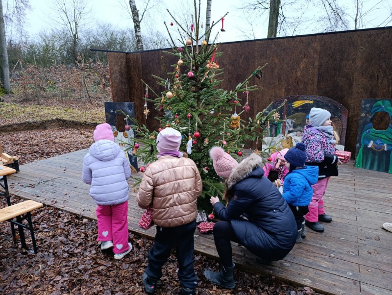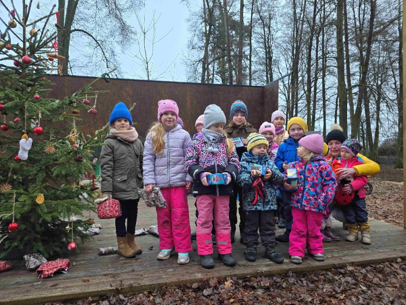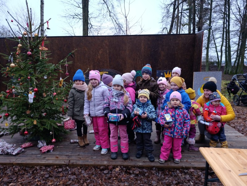 Vánoční dárky pod stromečkem čekaly na děti v lesním divadle v pondělí 22.12.2025. Ježíšek zde nadělil o dva dny dříve! Děti si také mohly namalovat obrázek vánočního stromku nebo si zaběhat a pohrát v prostoru lesního divadla. Bylo zde připraveno vánoční občerstvení a všichni se mohli  ohřát u dvou otevřených ohňů.