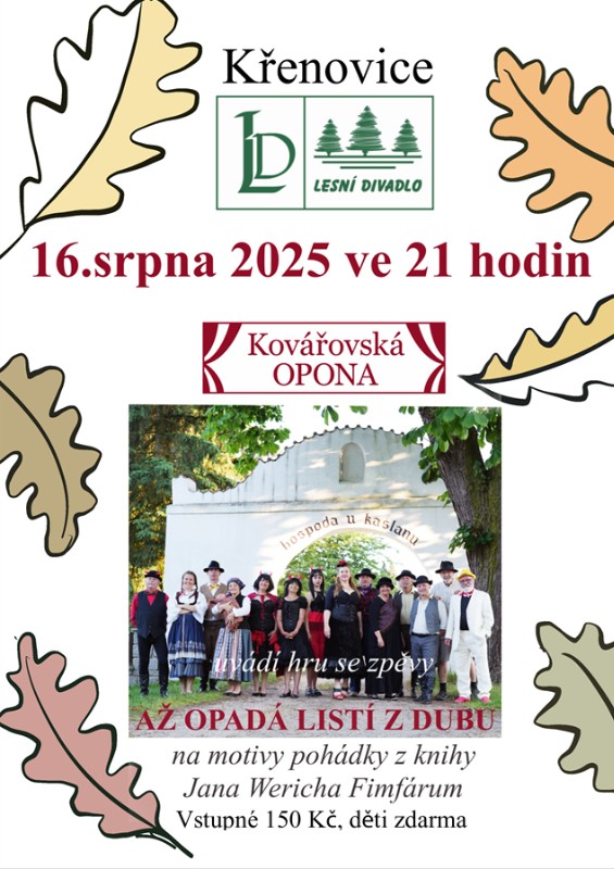 Kovářovská opona uvede v Lesním divadle v Křenovicích svoji hru Až opadá listí z dubu. Jste všichni zváni na sobotu 16.8.2025. Areál lesního divadla otevřen od 20.00. Občerstvení zajištěno. Vstupné 150 Kč. Vice viz plakát: